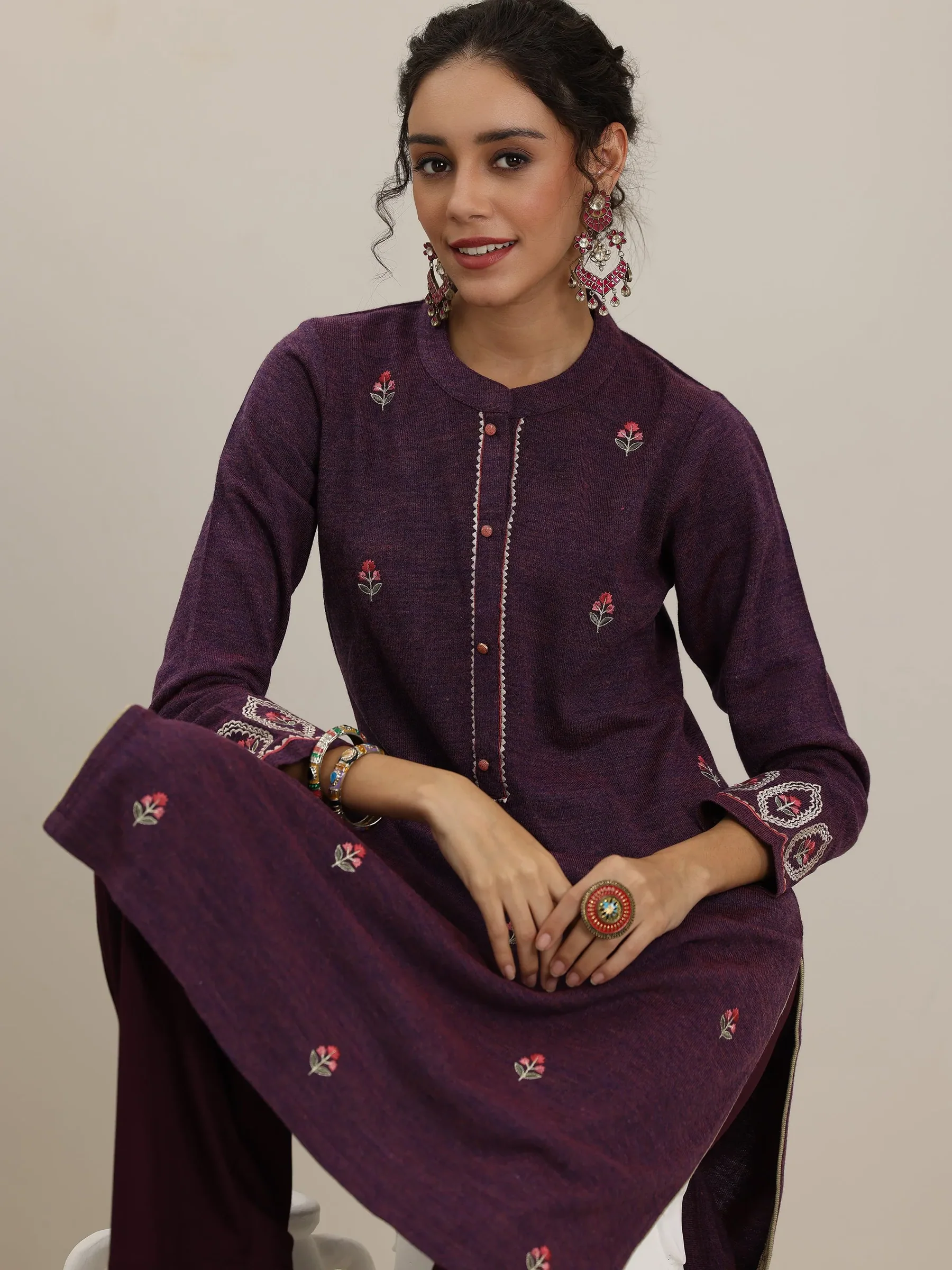 Wine Embroidered Wool Straight Kurta